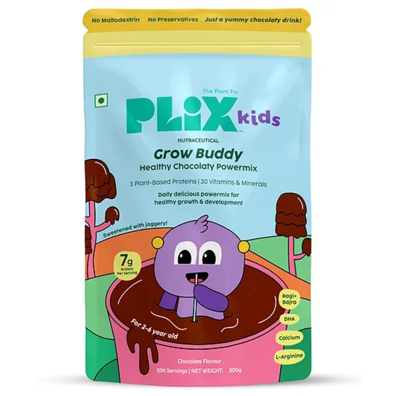 Fuel your child’s growth journey with Plix Kids Grow Buddy Powermixa plant-powered protein blend that’s as delicious as it is nutritious! Featuring 3 key plant proteins from peanuts, mung beans, and almonds, this chocolate-flavored mix is specially designed to support muscle development, boost height, and strengthen bones. The added millet blend of ragi and bajra ensures a rich source of calcium and magnesium, crucial for growing bones and muscles. Plus, L-Arginine works to promote muscle repair and overall growth. Our essential vitamin blend, packed with vitamins A, B, C, D3, and K2, supports everything from vision and cognitive development to immune system health. With no artificial sweeteners, refined sugar, or preservatives, Plix Kids Grow Buddy Powermix is the clean and wholesome nutrition choice you can trust. Just add 2 scoops to warm milk, stir, and sip for a nutritious treat that helps your child grow strong, stay energized, and thrive every day. Ideal for kids who need extra support in their daily growth and wellness journey!Items included in the package ;1 Packet of Grow Buddy Chocolaty Powder
