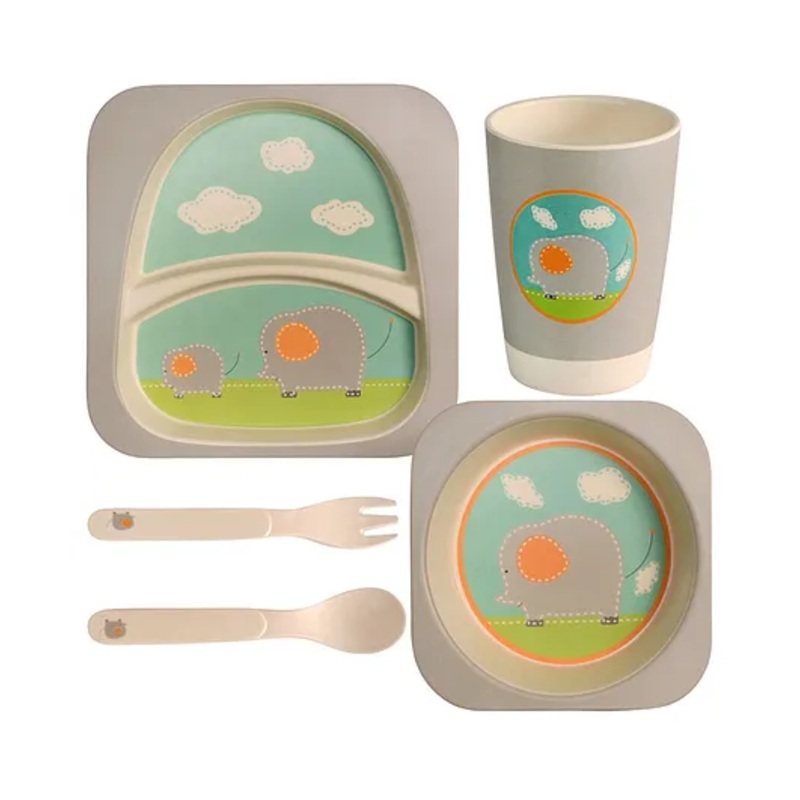 Polka Tots Eco-Friendly 5-Piece Bamboo Fiber Feeding Set For Babies, Toddlers, & Kids Includes Plate, Bowl, Glass, Spoon, Fork Baby Elephant Design | Kids Tableware & Crockery Set