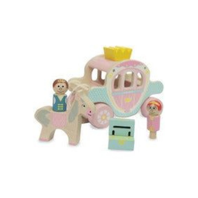 A royal wooden carriage that features a prince and princess, a horse and a treasure chest. A removable roof capped by a golden crown provides access to the internal cabin. Horse can be ridden by the prince or the princess; either attached to the carriage o