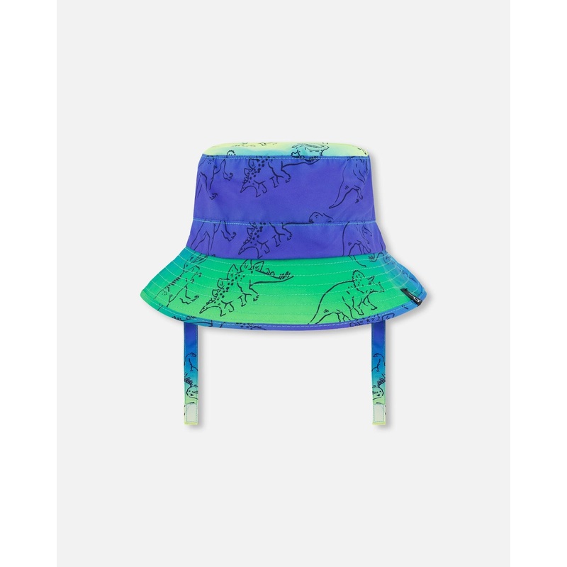 Shield his eyes and protect his skin from harsh UV rays with our Printed Beach Hat Vibrant Blue and Green Dino. Offering UPF 50+ sun protection, this bucket hat features a bold gradient print with allover dinosaurs, a downturned brim, and Velcro straps tha