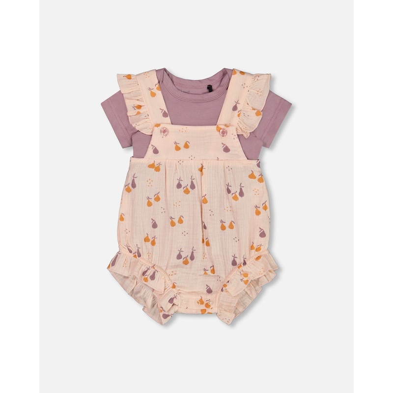 Printed Muslin Shortall And Organic Cotton Onesie Set Peach With Pears