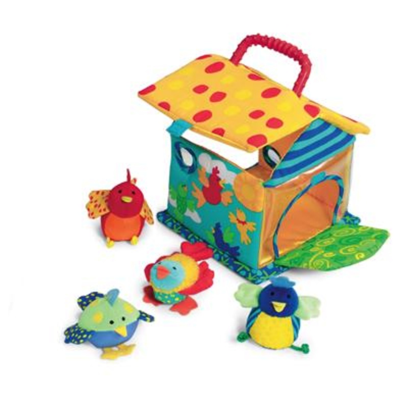 Four colorful birds all have different textures, and the easy-open roof and door are perfect for tiny hands. A favorite. For ages 9 month and up.