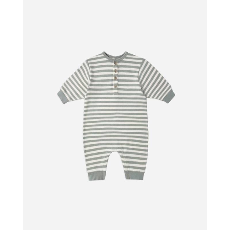 Our cozy Relaxed Jumpsuit, detailed with coconut buttons and ribbed trim is perfect for your little ones fall and winter wardrobe. Bottom snaps on sizes 0-3M to 18-24M make for easy changes.Featuring our 'blue stripe' pattern.Care: Machine wash cold. Tumbl