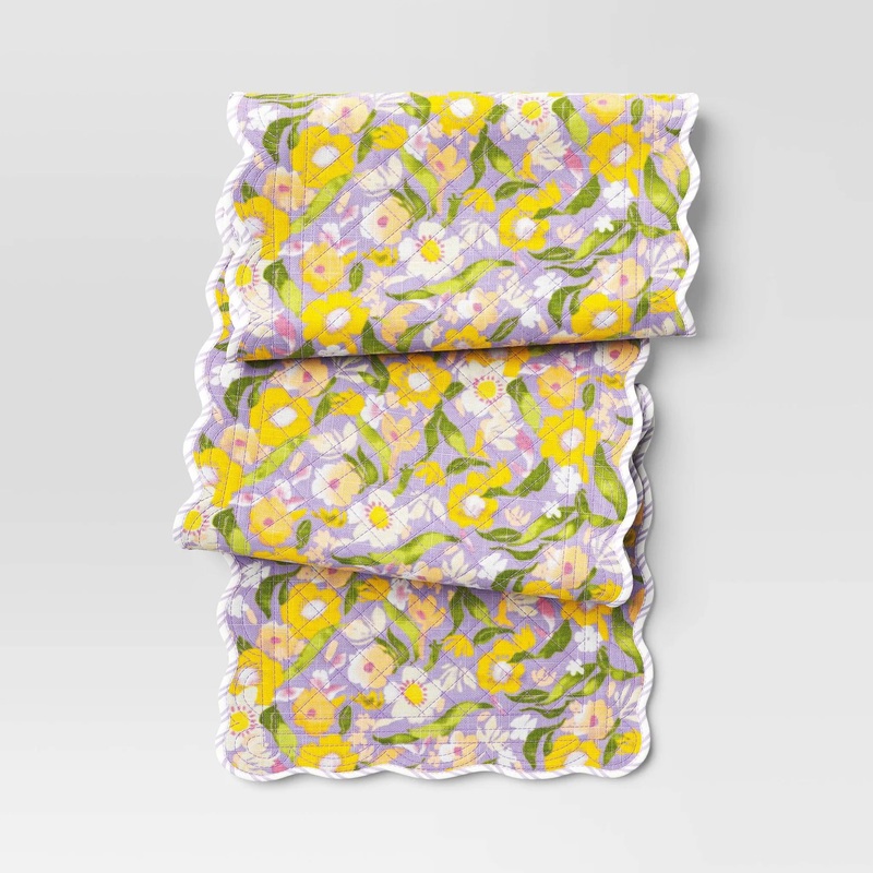 Add a touch of decorative style to your dining table with this Reversible Purple Striped Table Runner from Threshold. Made from 100% cotton slub fabric with 100% cotton backing, this decorative table runner features a multicolor floral print in muted yellow and white hues on a purple background, making it a great pick for everyday meals or special occasions. Featuring allover stitch detailing, it has a scalloped border that lends elegant flair. The reversible design adds versatility, and best of all, you can toss it in the washing machine for a quick refresh when needed.