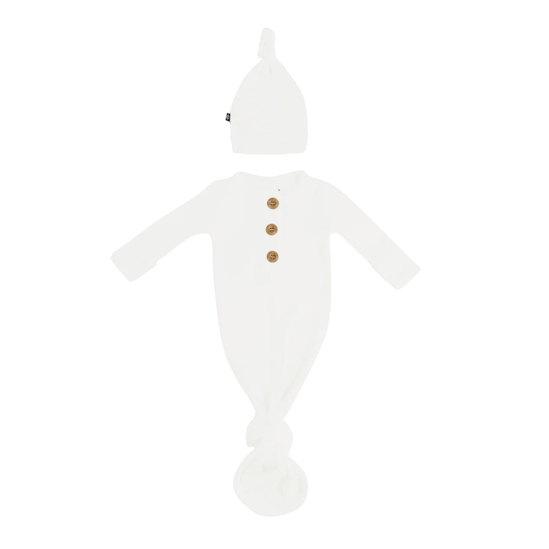 This all-in-one outfit is the softest newborn essential designed with both you and your baby in mind. Crafted from soft, stretchy ribbed bamboo, this gown features a tie bottom for easy diaper changes and comes with a knotted turban for the finishing touch