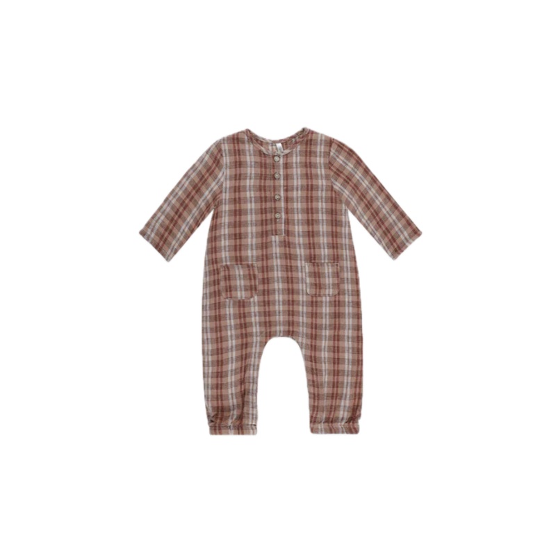 Long sleeve jumpsuit with coconut buttons down the chest, and hidden snaps along the inseam for easy changing. Elastic at leg openings for the perfect fit.Featuring our 'autumn plaid' all-over print.Care: Machine wash cold. Tumble dry low. Minor shrinkage
