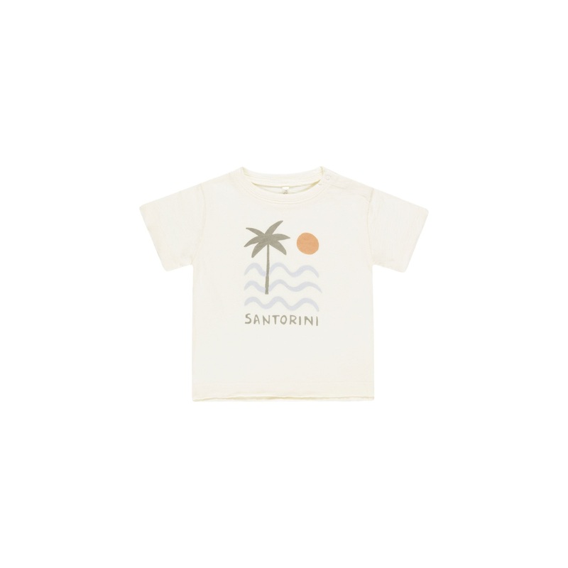 This comfortable tee is made from our cotton slub fabric with a raw finish hemline for an edgy flare. Shoulder snaps included on sizes 0-3M - 18-24M for easy changing.Featuring our Santorini spot print on our ivory hue. Soak up the sunshine and all the San