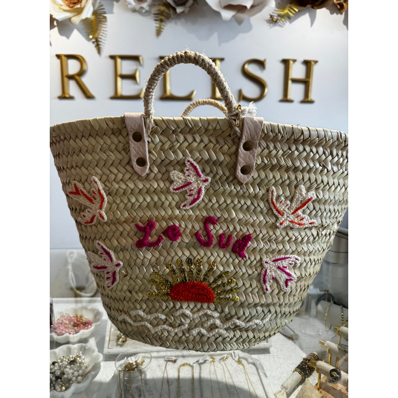 Wicker basket embroidered with wool thread and sequins in a "Le Sud" rising sun motif. Natural color leather handles. Dimensions: 40 x 30 x 25 cm.100% wicker and 100% leather handles. Care : Since straw is a natural product, it is possible that your basket
