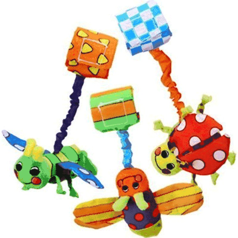 Sassy baby bugs on board includes three cute bugs that can attach to infant carriers or strollers; the dragonfly shakes and buzzes when pulled, and the ladybug and grasshopper rattle and chime.