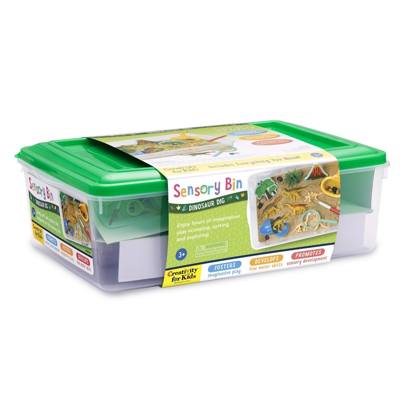 Sensory Bin Dinosaur DigPretend, create, imagine and explore with hands-on Sensory Bins. Sensory Bins are full of fascinating materials that foster imaginative play, develop fine motor skills and promote sensory development. Great activity for independent