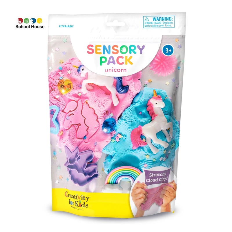 With Sensory Pack Unicorn and unicorn-themed components, toddlers will engage the senses and build fine motor skills, as they explore all of the textures, colors and shapes. This sensory play activity features two colors of super-soft, lightweight, stretchy cloud clay, offering endless squishing, stretching, stamping, and molding fun. Cloud clay is perfect for little hands, remaining pliable and never drying out. 2 unicorns and and other intriguing enchanted objects, enhance the sensory experience, adding an extra layer of excitement.