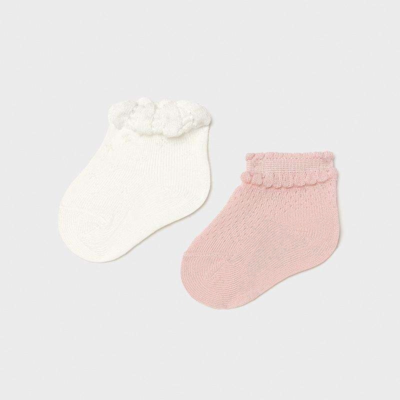 Practical set of two pairs of socks for newborn girl 0 to 18 months. Made from soft elasticated cotton fabric. Decorative elements: openwork details.