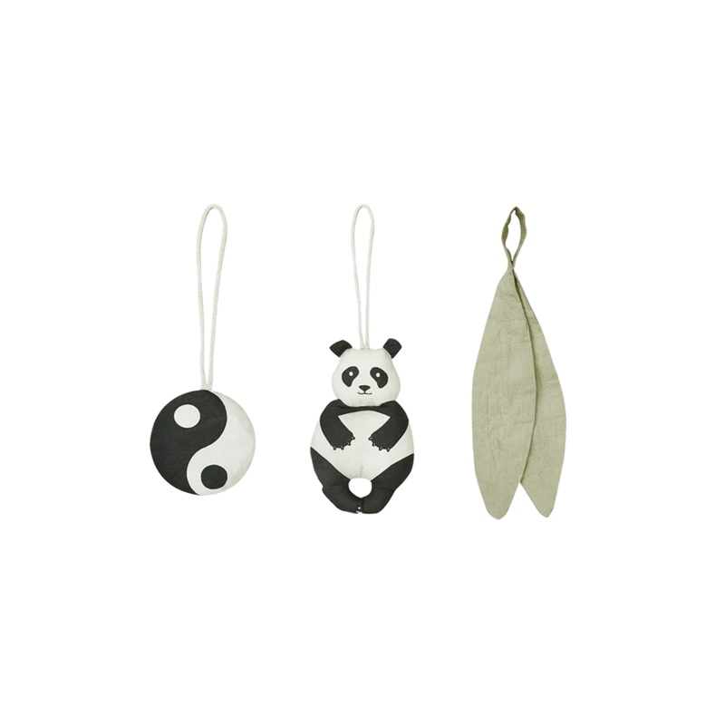 Crafted from gentle organic cotton poplin, our babygym rattle toy hangers are a delightful set featuring a soft panda, a bamboo leaf, and a round Yin-Yang symbol. Each hanger is thoughtfully designed with built-in rattles and crinkle paper, providing engag