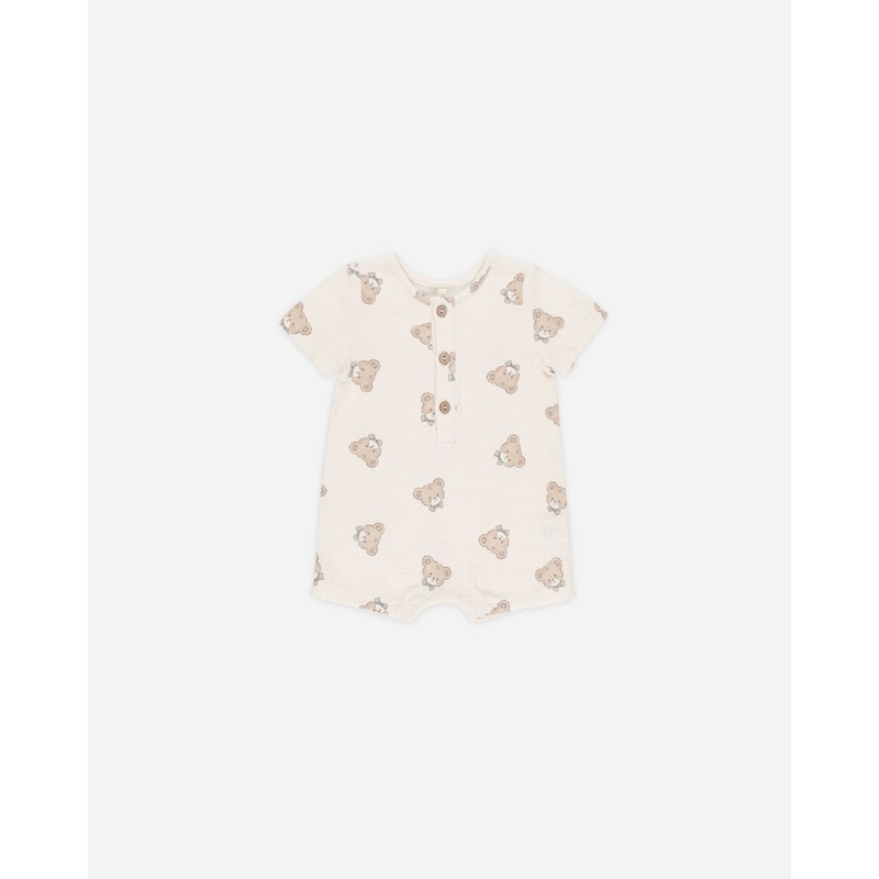 A sweet and easy look for sunny days, our Short Sleeve Woven Romper features a front button placket and bottom snaps for easy wear.Featuring our vintage teddy print on our natural hue. Care: Machine wash cold. Lay flat to dry.Made of 100% organic cotton.