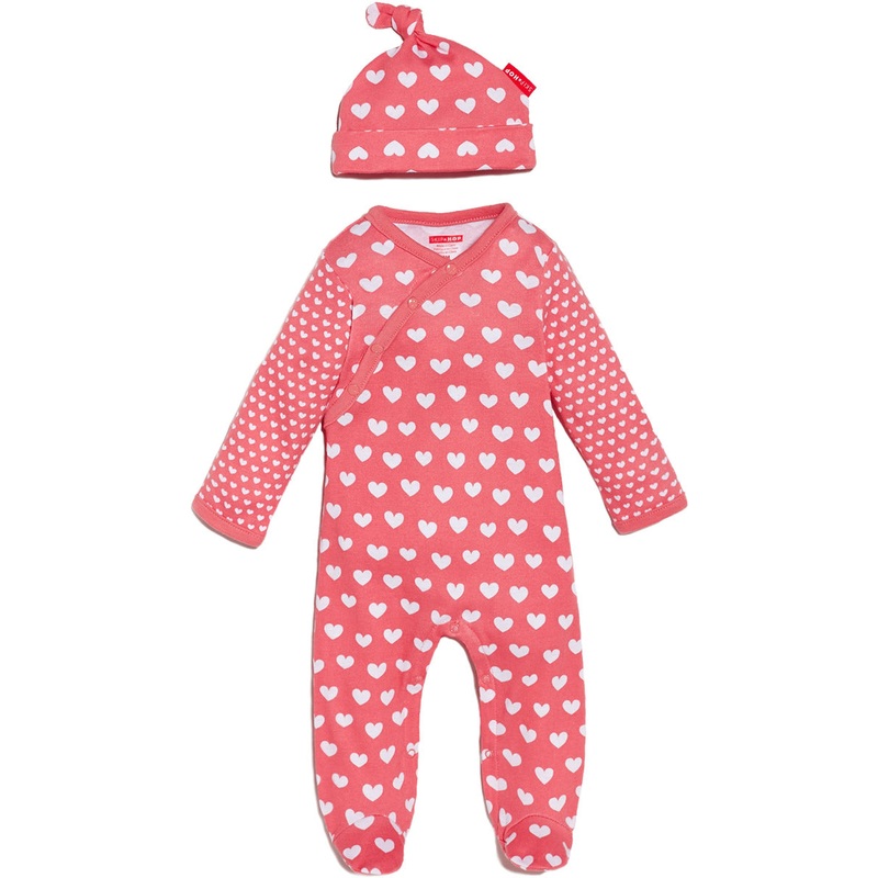 The perfect gift, Skip Hop's POP Prints two-piece layette set includes a long sleeve footie and a matching baby hat. It's available in four bright colors?watermelon, tangerine, lime and blueberry?with fun shapes like hearts, dots, stars and triangles. Set