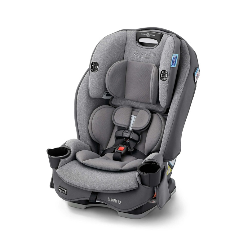 The Graco SlimFit LX 3-in-1 Car Seat grows with your child, from rear-facing harness (5-40 lb) to forward-facing harness (22-65 lb) to highback booster (40-100 lb). The slim car seat saves space in your back seat and includes pockets for extra storage, while giving your child plenty of room to grow. The unique rotating cup holders simply rotate away, making the seat 10% slimmer to save precious back seat space, while myPocket keeps the things your child would want within reach. The Simply Safe Adjust Harness System means you can easily adjust the harness and headrest together to accommodate your growing child with ease. Plus, the Rapid Remove cover quickly and easily removes for cleaning. You can keep your child comfortable with 4 recline positions, while the InRight LATCH system makes installation easy with a one-second attachment. The seat is Graco ProtectPlus Engineered to help protect your little one in frontal, side, rear, and rollover crashes.