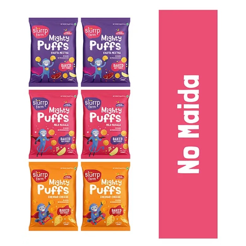 Slurrp Farm Not Fried Khatta Meetha Chaat Magic Cheddar Cheese Combo Puffs Pack of 6 – 20 g Each
