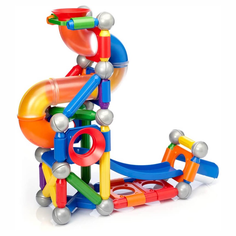 Get into magnetic excitement where building is just as fun as playing!With a click and magnetic snap, a sleek ball run is easily put together. From then on out, the fun escalates fast as kids get the balls rolling.Tunnels and tubes create crazy twists and