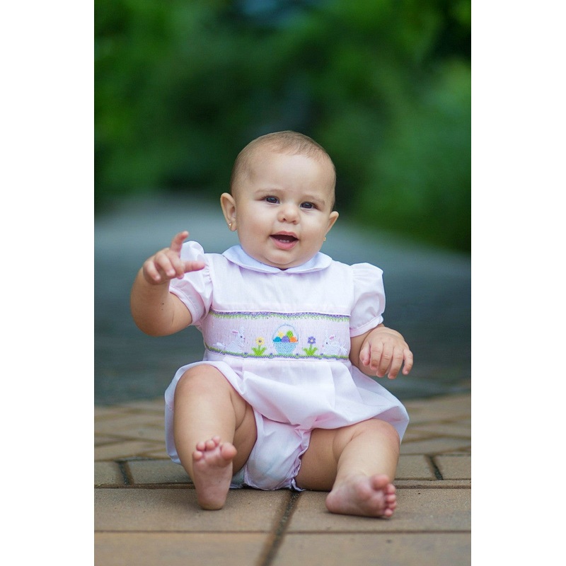 Looking for the perfect Easter gift? Look no further than our adorable Carriage Boutique Smocked Bunnies Baby Girl Bubble Romper Easter Outfit! This bubble romper features two hand-smocked bunnies with colored eggs in a basket and lovely flowers. It's perf