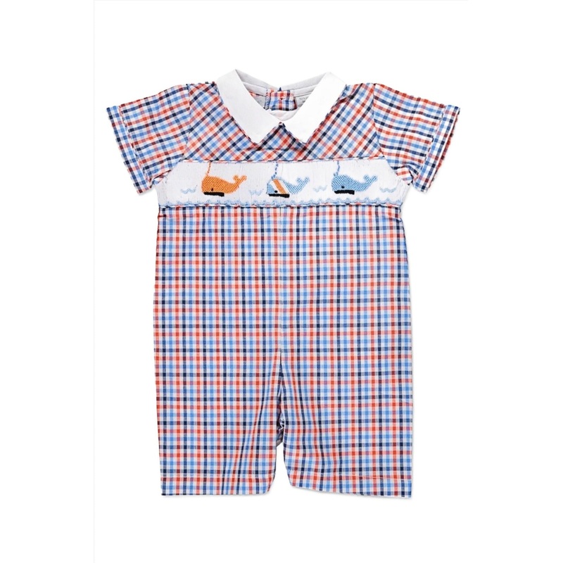 Designed for convenience, it boasts snap closures for easy diaper changes and adjustable shoulder straps for a customized fit. The combination of vibrant colors and whimsical design makes this romper a versatile choice for any adventure, whether it’s a day at the beach, a family picnic, or a playful afternoon at home. Dress your little sailor in the Smocked Whales Plaid Shortall Baby Boy Romper and watch him charm everyone with his irresistible style and endless cuteness.