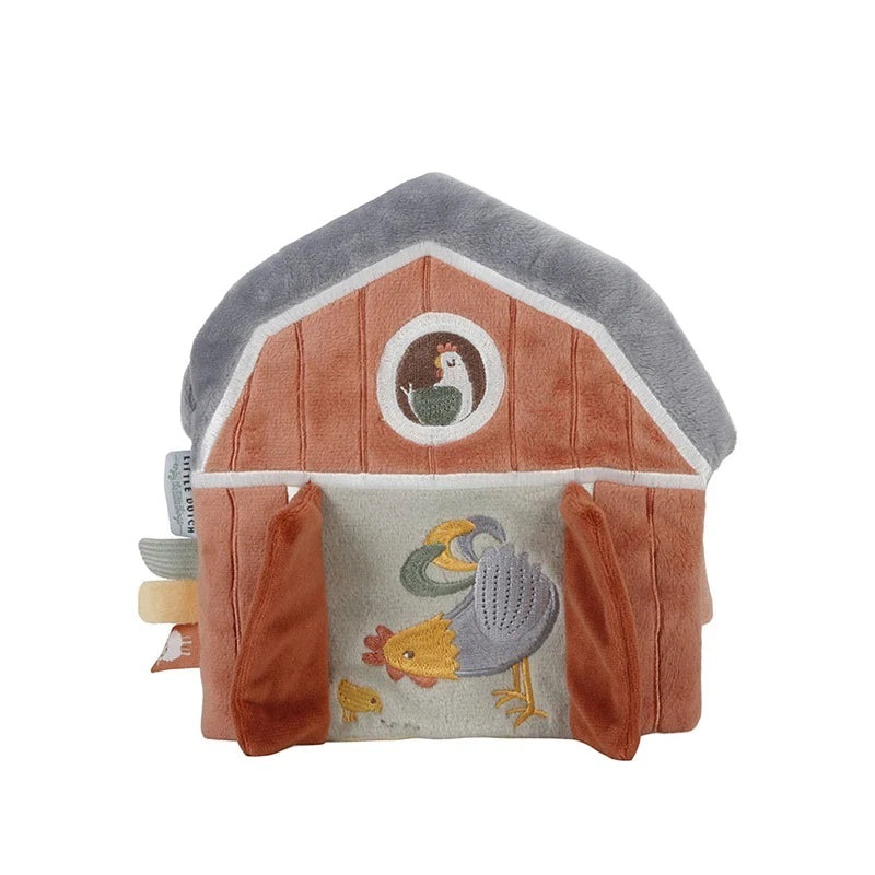 Babies never get bored with this colorful activity book of Little Farm in the shape of a barn. There is so much to discover with the various materials and activities, such as a mirror, rattle, and hidden toys. The soft book also has different labels to tou