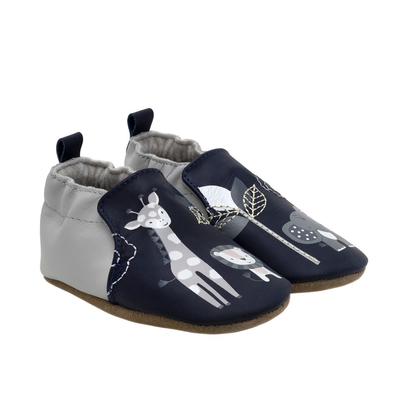 The Hello World Soft Soles in Navy feature a kid-friendly safari scene printed across both feet with embroidered trees and clouds. Complete with a navy leather upper and light gray elasticized ankle, these unisex infant soft soles offer a roomy, comfortable fit that’s kick-proof and stays on while allowing space for growing baby feet to move freely.