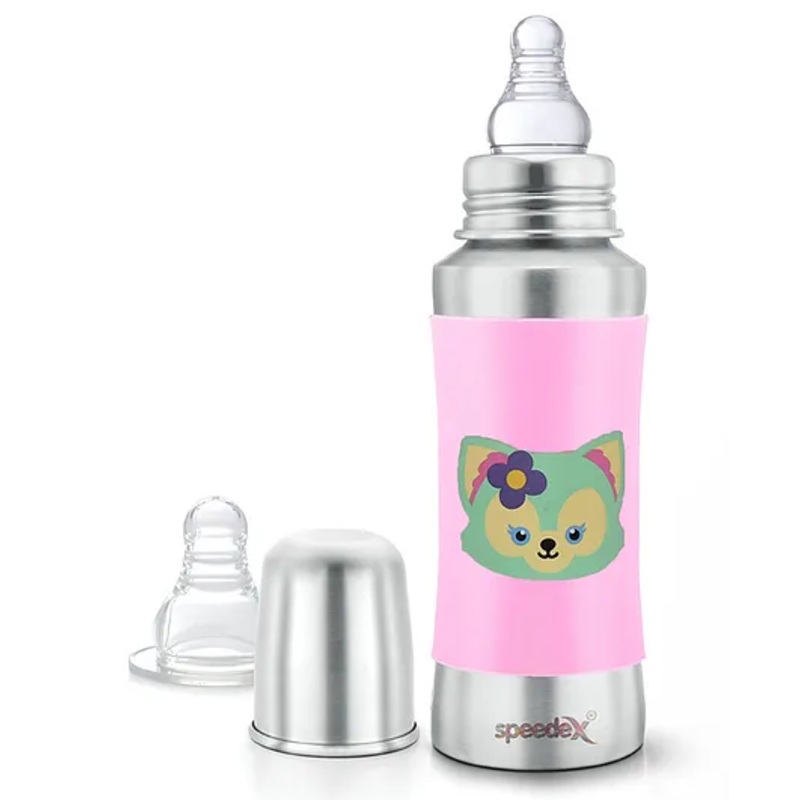 The Speedex Stainless Steel Baby Feeding Bottle with Cartoon Fox Print is designed to make feeding time fun, safe, and hygienic. Its stainless steel body ensures durability and hygiene, while the soft silicone nipple provides natural comfort for babies.