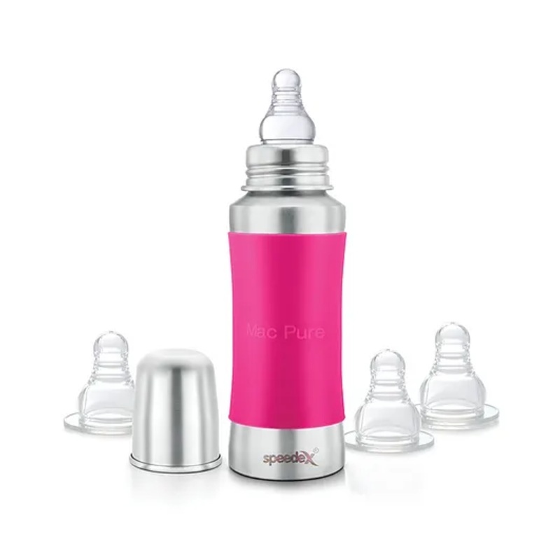 Lightweight & Easy to Carry Ergonomic design with a Pink anti-slip grip makes it convenient for both parents and infants.Safe & BPA-Free Crafted from food-grade stainless steel with a soft, BPA-free silicone nipple for healthy feeding.Leak-Proof Cap Secure stainless steel cap prevents spills, ideal for diaper bags and travel.Rust-Proof & Durable Long-lasting stainless steel ensures hygiene and durability.Fridge-Friendly Design Can be stored in the refrigerator to keep milk or liquids fresh.HOW TO USEClean Before First Use Wash bottle, nipples, and cap with warm soapy water and sterilize for added safety.Fill the Bottle Pour in milk, formula, or water, leaving space to prevent overflow.Secure the Lid Screw the ring tightly and cover with the protective stainless steel cap.Feed the Baby Remove the cap and allow the baby to drink through the soft silicone nipple.After Use Wash and sterilize thoroughly before the next use.SPECIFICATIONSBrand SpeedexType Baby Feeding BottleAge Group Suitable for infants & toddlersMaterial Stainless Steel with BPA-Free Silicone NippleLeak Proof YesRust Proof YesCapacity 240 mlColor Silver with Pink GripDimensions Compact, baby-friendly ergonomic designPRODUCT DESCRIPTIONThe Speedex Stainless Steel Baby Feeding Bottle with Pink Grip is a premium, eco-friendly solution for safe and convenient feeding. Designed with a soft silicone nipple that mimics natural feeding and a non-slip grip for easy handling, it ensures a comfortable experience for parents and infants alike.Its lightweight, durable, and rust-proof design makes it ideal for daily use, travel, or gifting to new parents. With its leak-proof cap and hygienic build, this bottle ensures a safe and spill-free feeding experience.ITEMS INCLUDED IN PACK1 Stainless Steel Feeding Bottle (Pink Grip)2 Silicone Nipples (1 attached + 2 extra)1 Protective Stainless Steel Cap