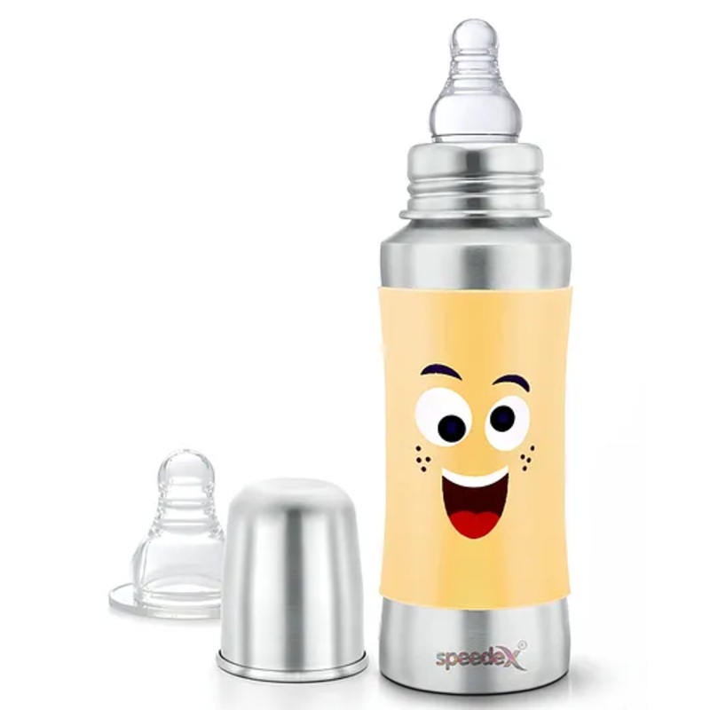 Speedex Stainless Steel Baby Feeding Bottle 240ml | Yellow Smiley Print | Internal ML Marking | Silicone Grip | Mirror Finish | No Extra Nipple