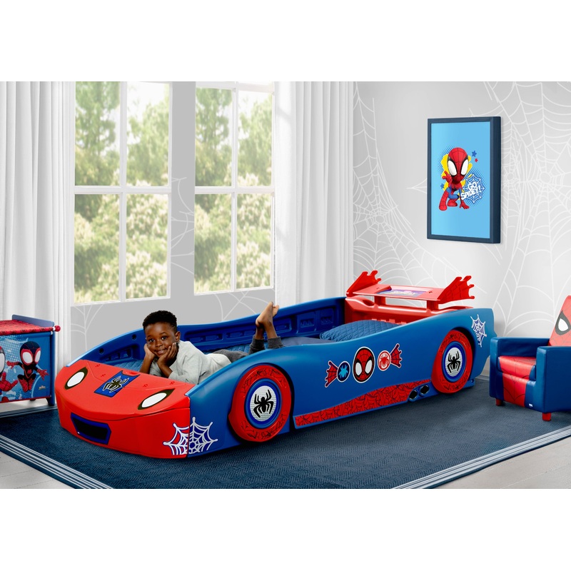 It's Spidey Time! Designed to resemble Spideys Web Crawler, the Spidey and His Amazing Friends Web Crawler Race Car Twin Bed by Delta Children features a webbed spoiler, colorful Spidey-inspired decals and super-cool racing wheels. What makes this twin bed