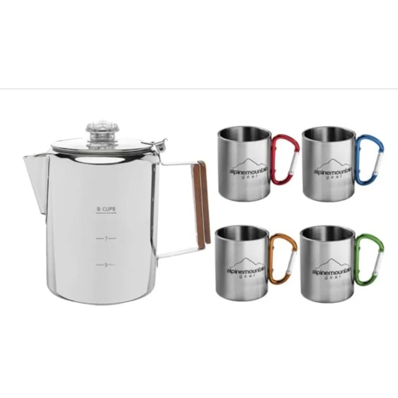 Highlights:Complete Coffee Set: Includes a 9-cup coffee percolator and 4 durable 12 oz carabiner mugs, perfect for brewing and serving rich, flavorful coffee for family or friends at home or on camping trips.Stainless Steel Durability: Crafted from high-qu