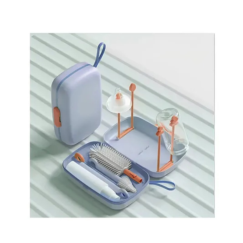 StarAndDaisy ‘We Care’ Baby Bottle brush Cleaner Set with Removable drying stand Tray Baby Bottles Drying Rack with Storage Box, soap dispenser, baby travel essential bottle brush set Blue
