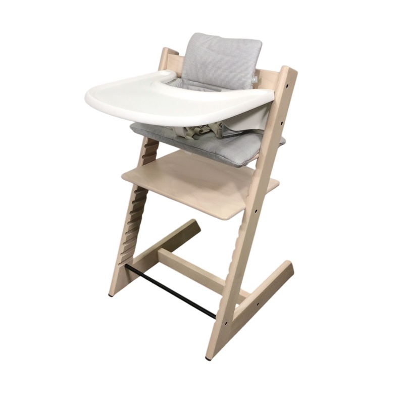 Condition: Gently Used The Stokke Tripp Trapp Chair bundle makes it easy to have your child at the table from birth to adulthood. This set includes the Tripp Trapp Chair, Newborn Set, Baby Set, Cushion, and Tray, ensuring comfort and functionality for your