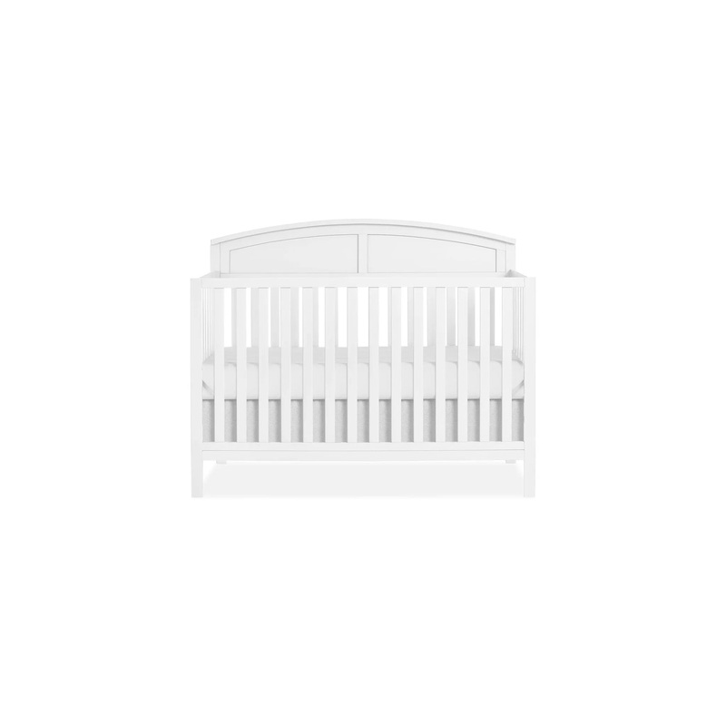 The Dream On Me Storybrooke 5 in 1 Convertible Crib effortlessly converts from crib to daybed, toddler bed & full-size bed (conversion kit sold separately), with a 3-position adjustable mattress height. This crib is JPMA & Greenguard Gold certified, meets/exceeds ASTM & SOR standards, is built with sustainable New Zealand Pinewood and sturdy wooden spindles, with non-toxic, water-based paint, and is easy to assemble and clean. It comes in 2 enticing finishes White & Pebble Grey.