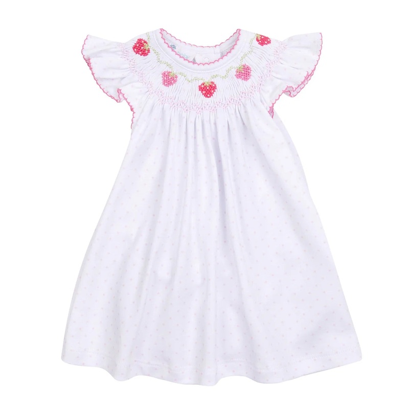 - Hand-Smocked Bishop Yoke: Features sweet pink strawberries and white embroidery.