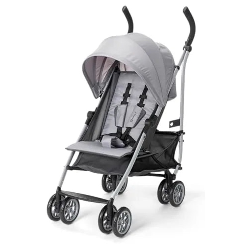 The Safety 1st Strollerette Compact Stroller lightens up every stroll with its compact size and ample storage space. With its plush foam handles and lightweight aluminum frame (at under 16.5 lbs.), you can zip around the grocery store, the park, or wherever you need to be. The stroller easily folds and stores in your trunk or closet. With the extra-large canopy, your child will sit comfortably in the shade even on sunny days. The peek-a-boo window lets you quickly look in and exchange a smile or two.