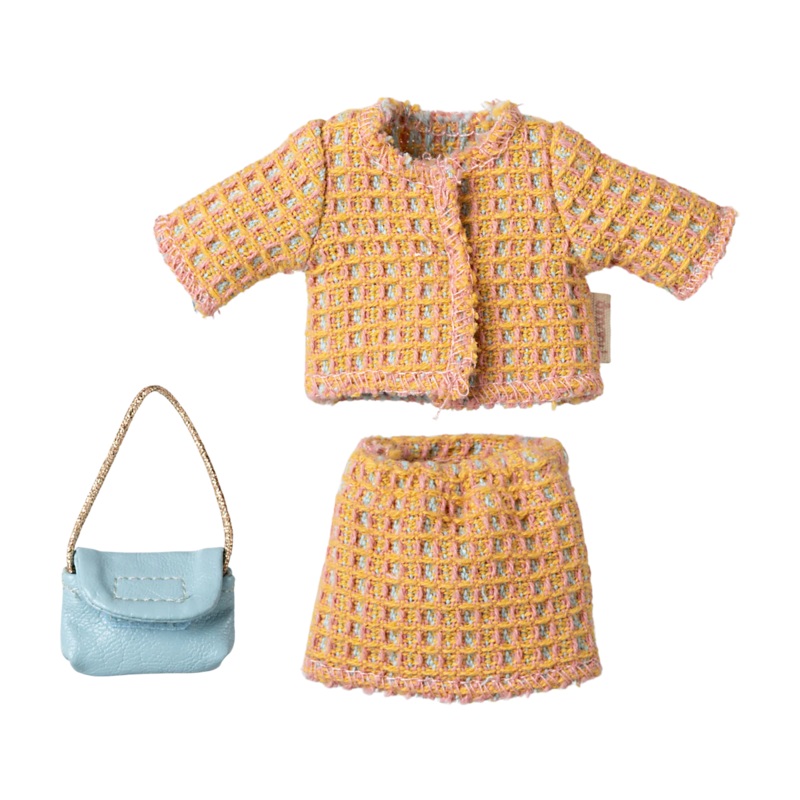 If you need a new set of clothes for your mouse this set will be a good choice. The suit is a short jacket and skirt. In the box you will find a real lady bag as well.DIMENSIONSHeight: 5.9in, Width: 3.1in, Depth: 0.6in, Net weight: 0.1lbRECOMMENDED AGE+3 Y