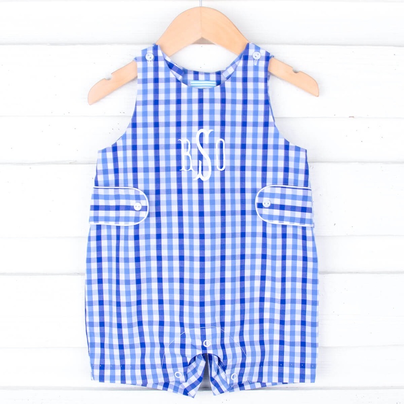 Celebrate the joys of summer in our Summer Time Blue Gingham Sun Jon Jon. This blue gingham outfit is the perfect addition that perfectly matches our Summer Time collection. Personalize the look with a monogram. With convenient shoulder buttons and snaps i