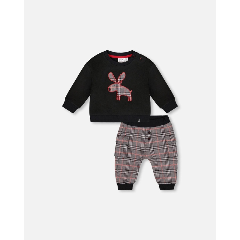 Our Sweater and Cargo Pants Set Black With Moose Applique offers a festive and comfy look for baby boys. The soft knit sweater features ribbed trims, a round collar, and a charming moose appliqu in a holiday plaid pattern, while the pull-on pants have a th