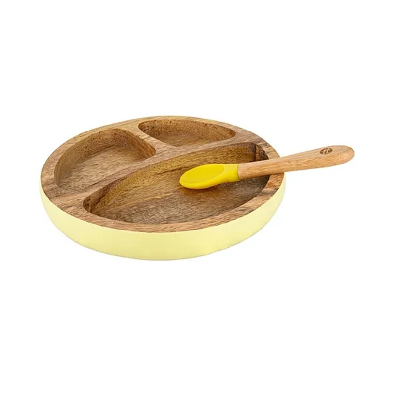 Easy clean up and messy free mealtimes made possible with our mango wood round plates with silicone suction and spoon that makes the plates stay in place.