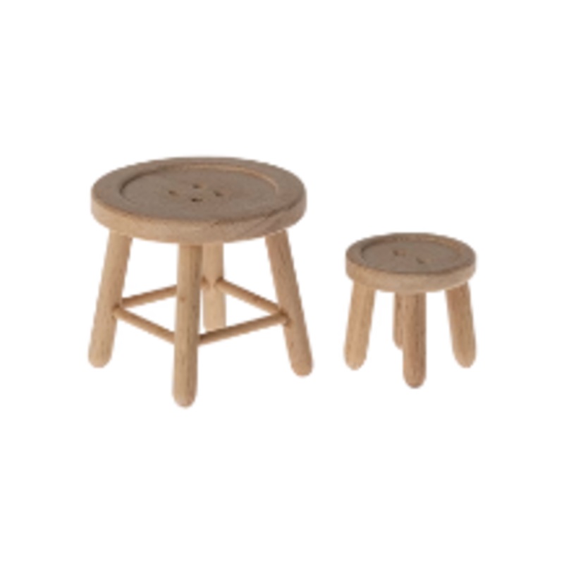 A stool and table set made for the mouse family. It is inspired by buttons and can be mixed with other mice furniture and accessories to create a lovely home. It fits perfectly into the Mouse Hole Farmhouse.SKU:11-4000-00Size:MouseHeight:1.96 in.Width:1.96