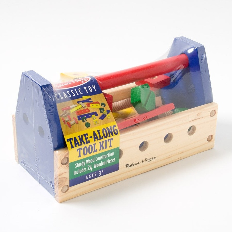 Give little builders the tools they need for truly constructive play! This 24-piece set includes wooden nails, screws, nuts, and bolts for hours of creative fun that also helps “build” important motor skills. Preschoolers will love using the hammer, wrench, and screwdriver to build their projects, then packing up all their equipment in the sturdy toolbox with handle. Pretend play with Melissa & Doug products helps to encourage imaginative, creative and independent play. This kid-sized tool set helps children develop hands-on fine motor skills, and improve manual dexterity and hand-eye coordination. Kids can also develop color, shape, and letter recognition, as well as counting skills. The Take-Along Tool Kit makes a great gift for kids aged 3 to 5 years. Add the Melissa & Doug Wooden Construction Building set to round out the hands-on play and to give kids an engaging option for screen-free fun.