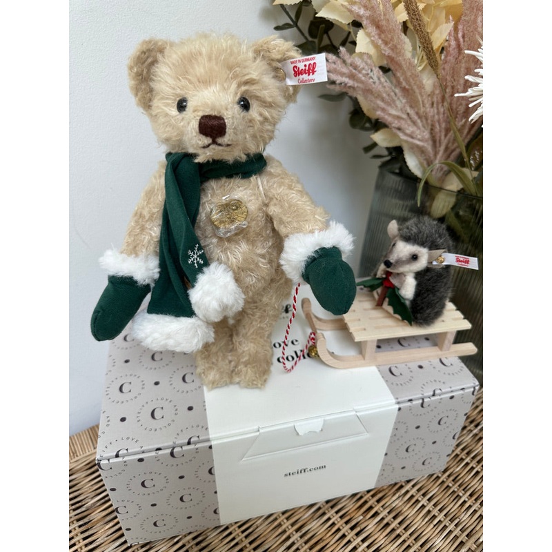 Steiff Limited Edition Teddy Bear with Hedgehog 2 piece set. Number 243A Limited Edition of only 2020 pieces Worldwide !!!At 25 cm tall and 5 way jointed, this adventurous light brown teddy bear made from alternative linen plush, is a perfect friend for th