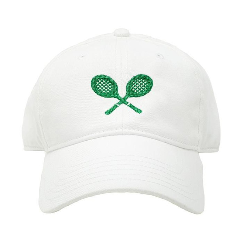 Tennis Racquets on White HatHarding Lane1 - 10 yrs (see below)adjustable white sail cloth back strap to customize fitheadcircumference16 - 21 incheslarge bill provides sun protectionpre-washed fabric100% cottonNeedlepoint embroidery