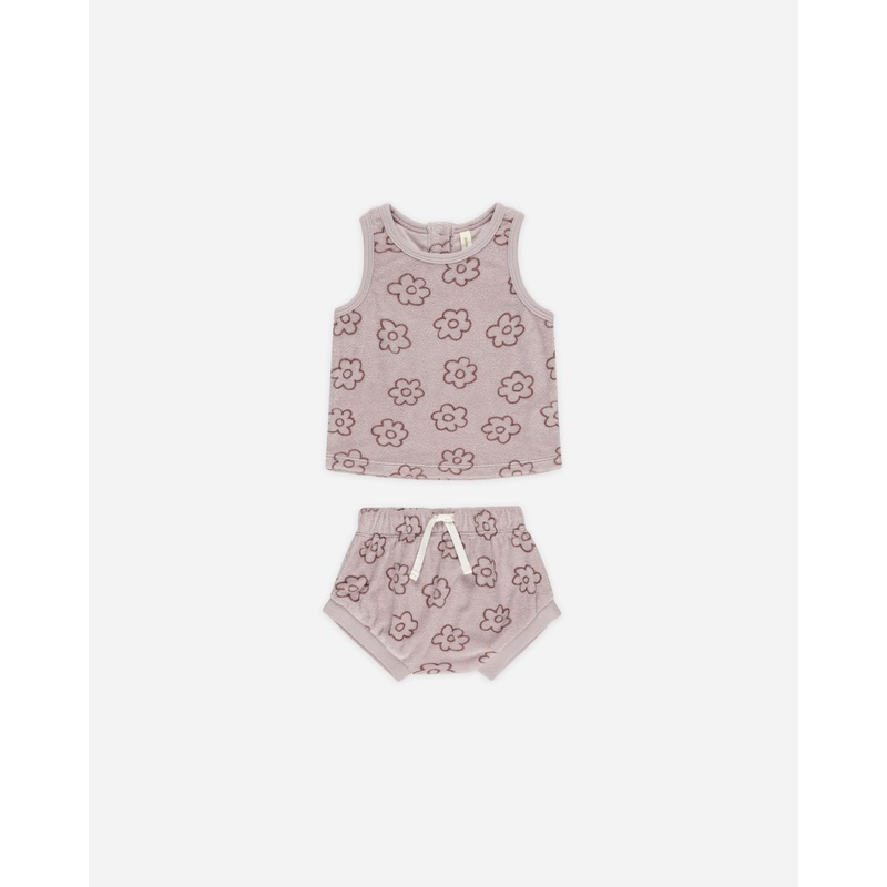 Our Terry Tank + Short Set is an easy warm-weather go-to. The tank features a snap-back closure for easy wear and the short features an elastic waist, drawstring, and ribbed leg openings for a perfect fit.Featuring our retro daisy print on our lavender hue