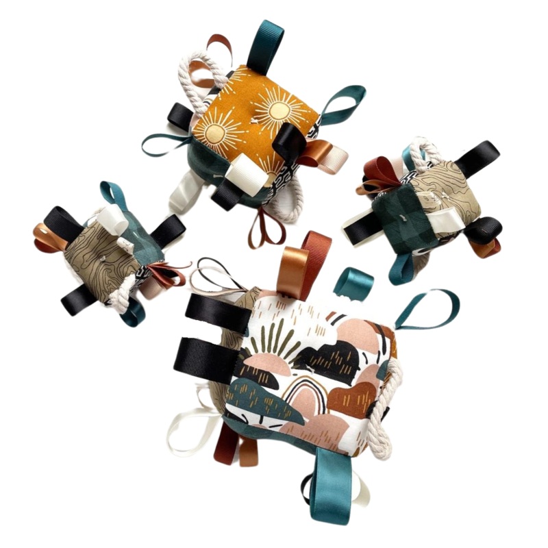 Earth tone baby block with ribbons and a rattle, including rainbows, dark plaid, signs, and energetic visual patterns. Constructed with modern, cotton fabrics, that are pleasant for all to see. Sensory engagement: ribbons for fingers & mouths, visual movem