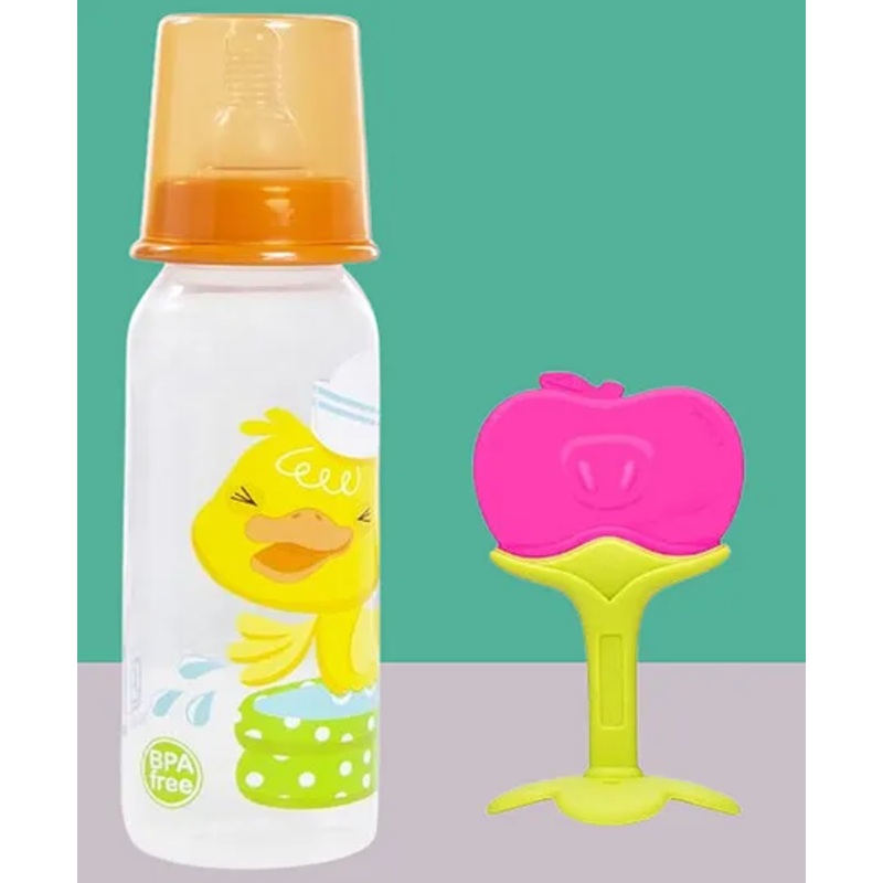The Cheeky Kidzz Baby Fruit Shape Soft Silicone Teether For Infants Dental Care With 250ml Feeding Bottle(ORANGE)