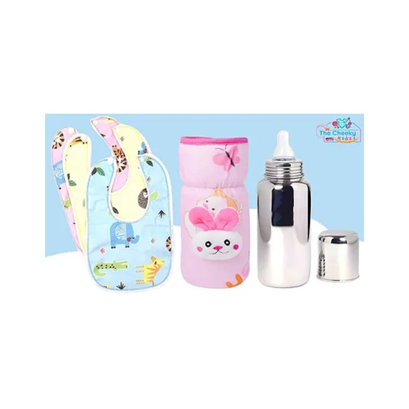 The Cheeky Kidzz Baby Stainless Steel Feeder Liquids Milk Juices Anti-Slip Feeding 240ml Bottle With Bottle Cover and 3 Cotton Bibs (PINK)
