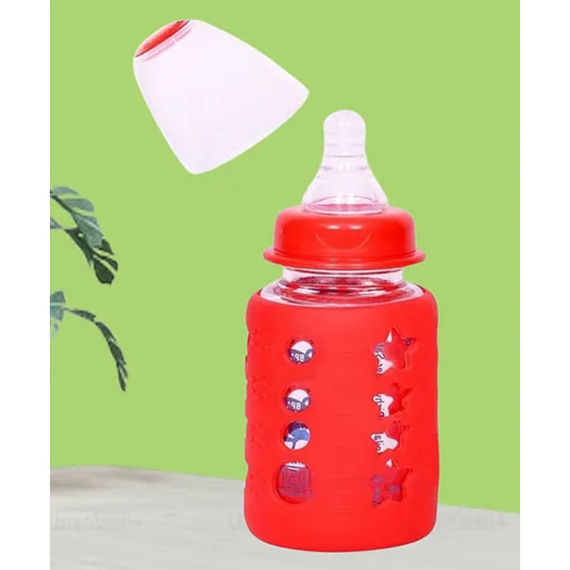 Scratch resistant and light weight, glass feeding bottle with protective silicone sleeve and leak-proof flat cap, durable heat resistant, & removable silicone cover which protects from dust and scratches.