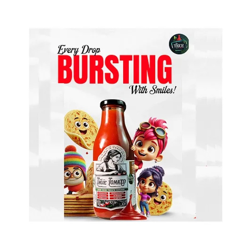 Highest Tomato Content Almost 2 kg of tomatoes used for every 1 kg of ketchup. One Spoon, One Tomato Each spoon of ketchup contains nutrition equivalent to one small-sized fresh tomato. No Chemicals Free from chemicals, oils, flours, additives, and artificial preservatives. No Added Starch or Pectin No artificial thickeners used to bulk up the ketchup. Natural Vinegar Contains Natural brewed vinegar that supports digestion and is gentler than chemicals and it is gut and throat friendly. Made for daily consumption Low Calorie & Fat-Free Handmade with traditional kitchen ingredients for a real, homestyle ketchup experience and Light and healthy for daily use. Rich in Nutrition High in Vitamin C, Vitamin A, Lycopene, and essential minerals. Gluten-Free Manufactured in a dedicated kitchen without exposure to soy, wheat, or gluten products. Desi Khand Sweetened Uses desi khand instead of refined sugar for better blood sugar control. Made Fresh Daily No old tomato pastes fresh tomatoes are handpicked, handwashed and processed every day. Handmade in Small Batches Crafted in cozy kitchen settings, ensuring hygiene and a homemade feel. Safe for Children Made from 100% natural kitchen ingredients without any chemicals.Specifications Brand – The True TomatoProduct Type – KetchupAge – 1+ YearsWeight – As per the titleFlavor – Classic Tomato KetchupProduct DescriptionThe True Tomato ketchup is India’s highest tomato content ketchup, made with almost 2 kg of fresh tomatoes for every 1 kg of ketchup about twice as much as regular ketchup. Every spoonful contains the goodness of one small-sized fresh tomato, delivering real homemade flavor and wholesome nutrition. Crafted in small batches with 100% natural kitchen ingredients and no chemicals, thickeners, or artificial preservatives, it’s a safe, gut-friendly choice for the whole family.Items Included In Package1 X The True Tomato Ketchup Bottle(Regular Ketchup flavor).